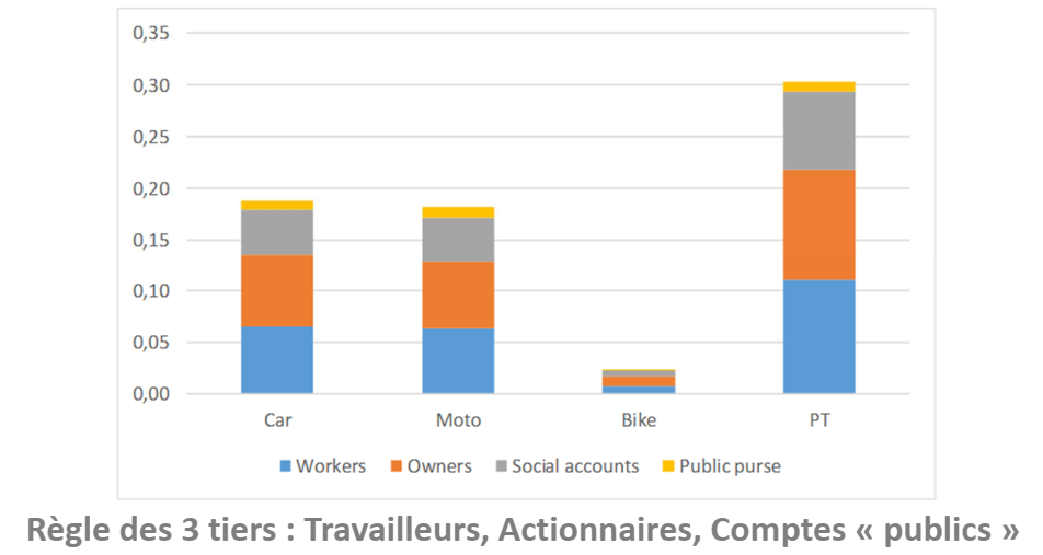 L’usage d’un mode de transport, et en amont sa disposition, induisent des dépenses d’argent. En se restreignant au véhicule, mais en envisageant les phases de fabrication et d’usage de son cycle de vie, les dépenses à plusieurs termes temporels (utilisation courante, entretien et assurance en base annuelle, acquisition en one-shot) se cumulent. Leur total est à rapporter aussi bien au « parcours de vie » du véhicule, donnant une empreinte macroéco en €/veh-km, qu’aux trafics de personnes sur ce parcours de vie, d’où une empreinte en €/p-km.