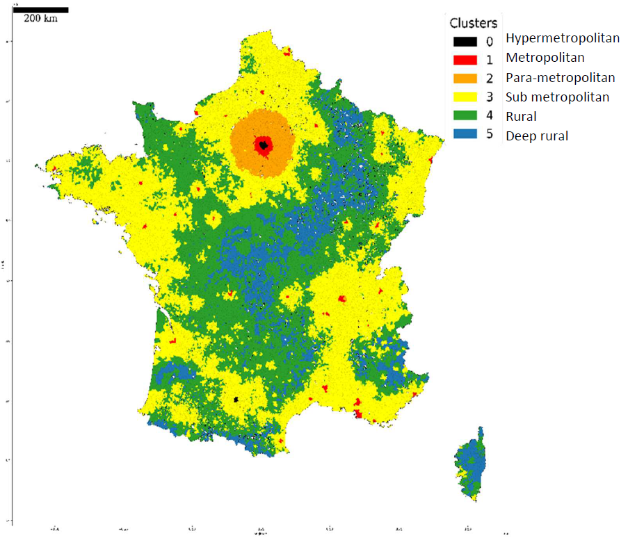 (3) Selon la commune de résidence, à quelles distances se trouvent les emplois occupés par les actifs ? Quels types statistiques se dégagent parmi les communes, selon la distribution des distances aux emplois occupés et aussi la distribution des distances entre la commune comme origine et, en destination, les opportunités situées d’emploi ? Quels macro-patterns se dégagent sur le territoire métropolitain ?